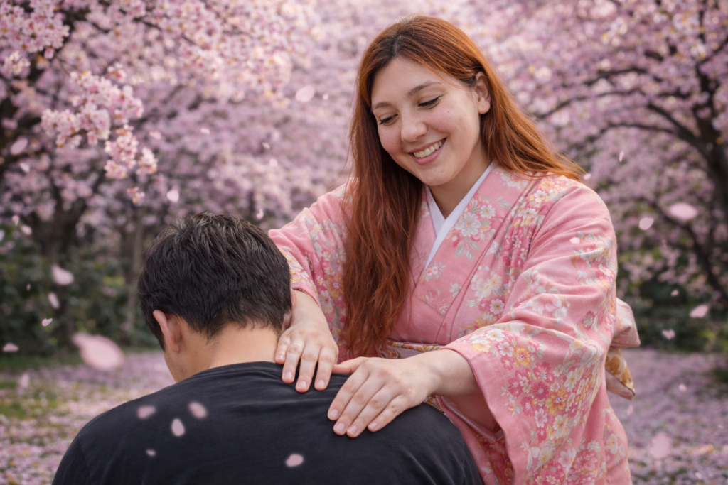 Le soin Évasion Japonaise est une immersion dans l’univers du bien-être japonais. Inspiré des rituels traditionnels, il utilise une huile à la fleur de cerisier (Sakura – 桜), symbole de douceur et de renouveau.